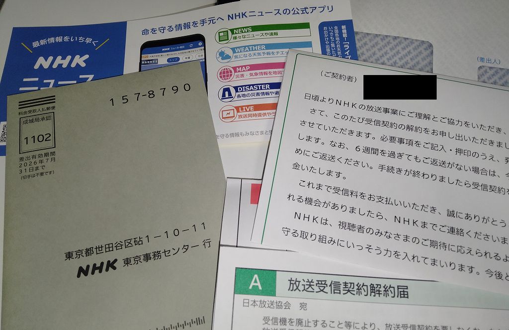 3月5日、NHKから解約申請の書類が到着。