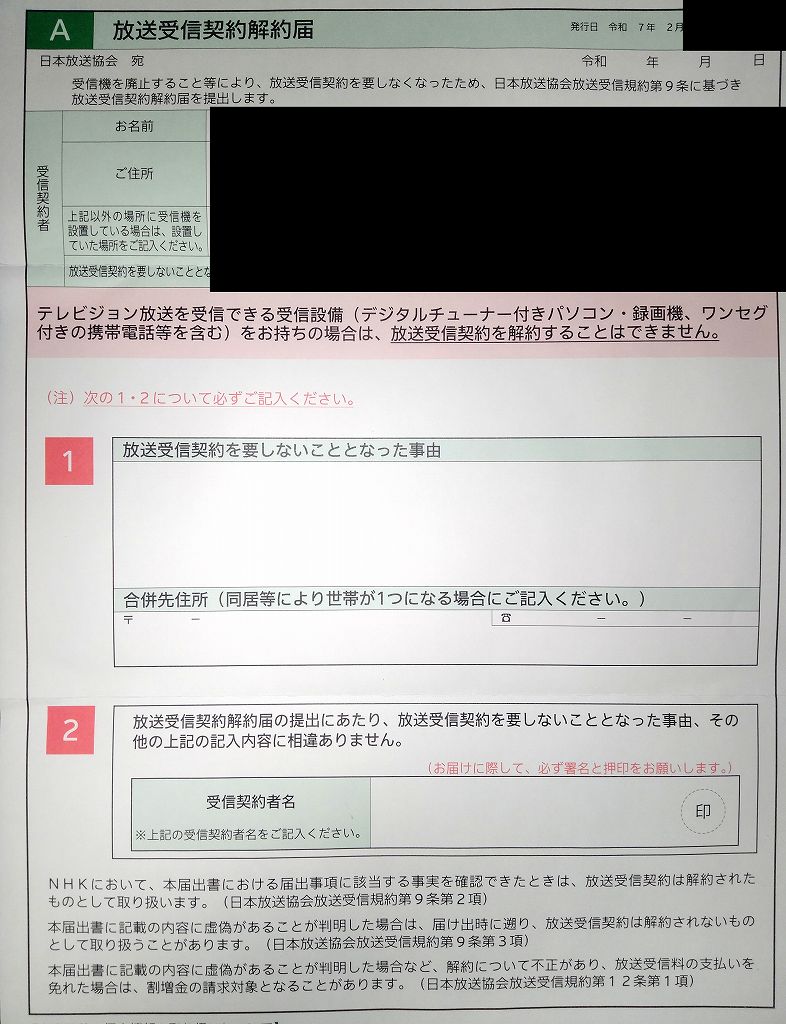 変に突っ込まれて、時間稼ぎをされても嫌なので、同封されていた用紙をしっかり読みつつ、「放送受信契約解約届」を漏れや間違いが無いように記入。